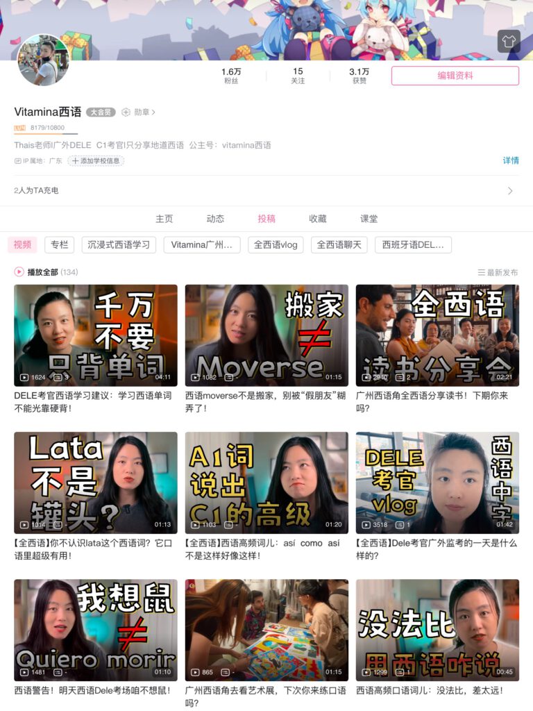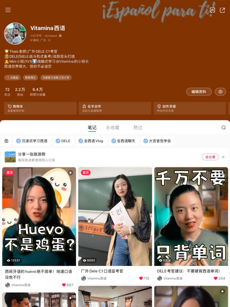 Como creadora de contenido en mi marca Vitamina西语, utilizada en distintas redes sociales como Bilibili (哔哩哔哩), Xiaohongshu (小红书) y la cuenta oficial de Wechat (微信公众号), tengo la oportunidad de educar y conectar a una amplia audiencia de estudiantes de español en China. Mi labor consiste en enseñar el idioma español y la cultura española, así como proporcionar mini cursos de español y escribir artículos que permitan una pequeña inmersión en el idioma.